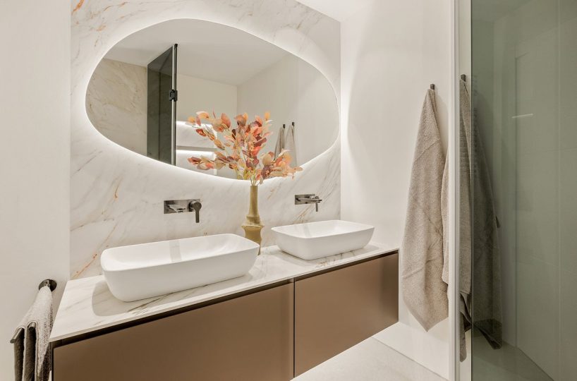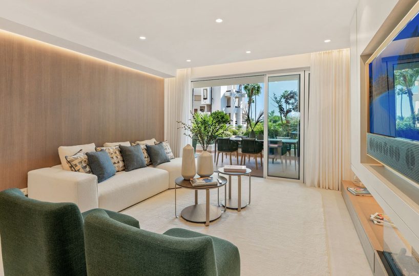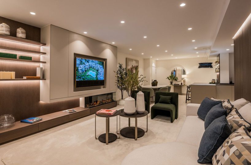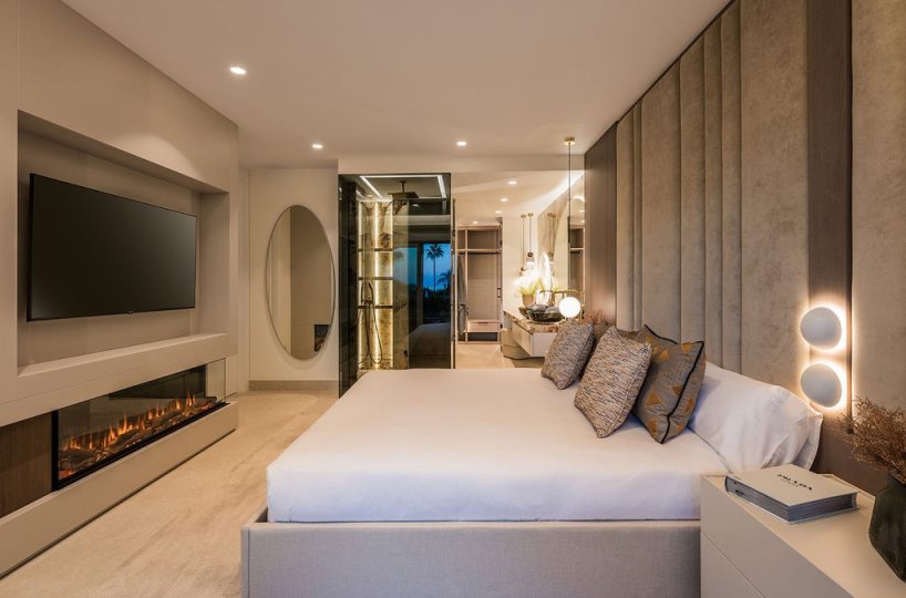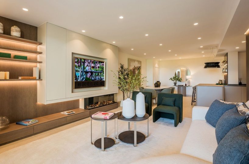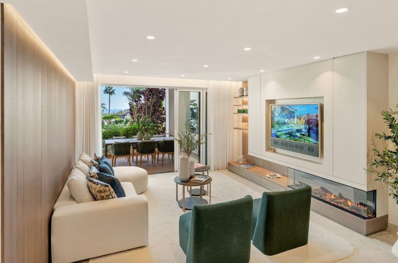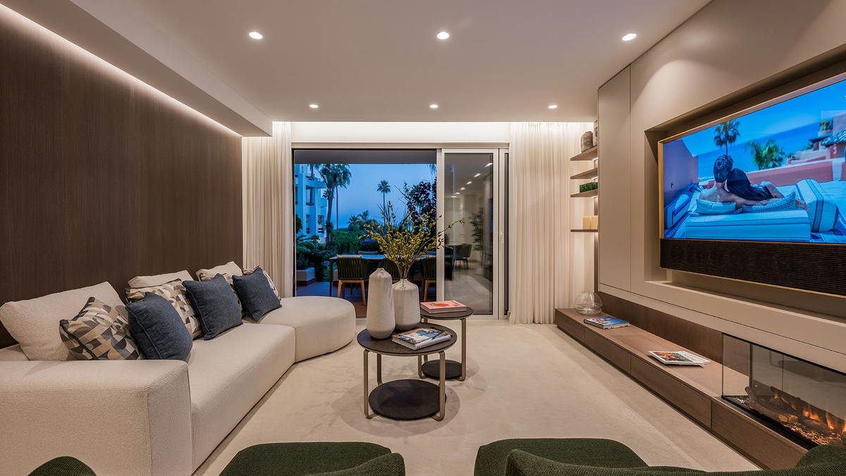 This stunning apartment features an open-plan living space with contemporary furnishings and high-end finishes, including custom wardrobes, elegant flooring, an electric fireplace, and a Bang & Olufsen sound system. The designer kitchen is fully equipped, and the open living area leads to a private terrace with sea views. Fully furnished and ready to move in.